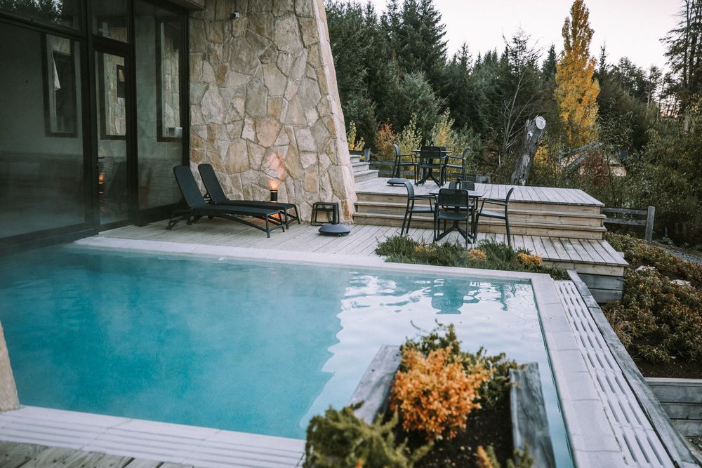 The pool area has two changing rooms, the in/out pool heated to 33°C and a solarium deck surrounded by a green environment and an unparalleled view of Cerro Bayo.